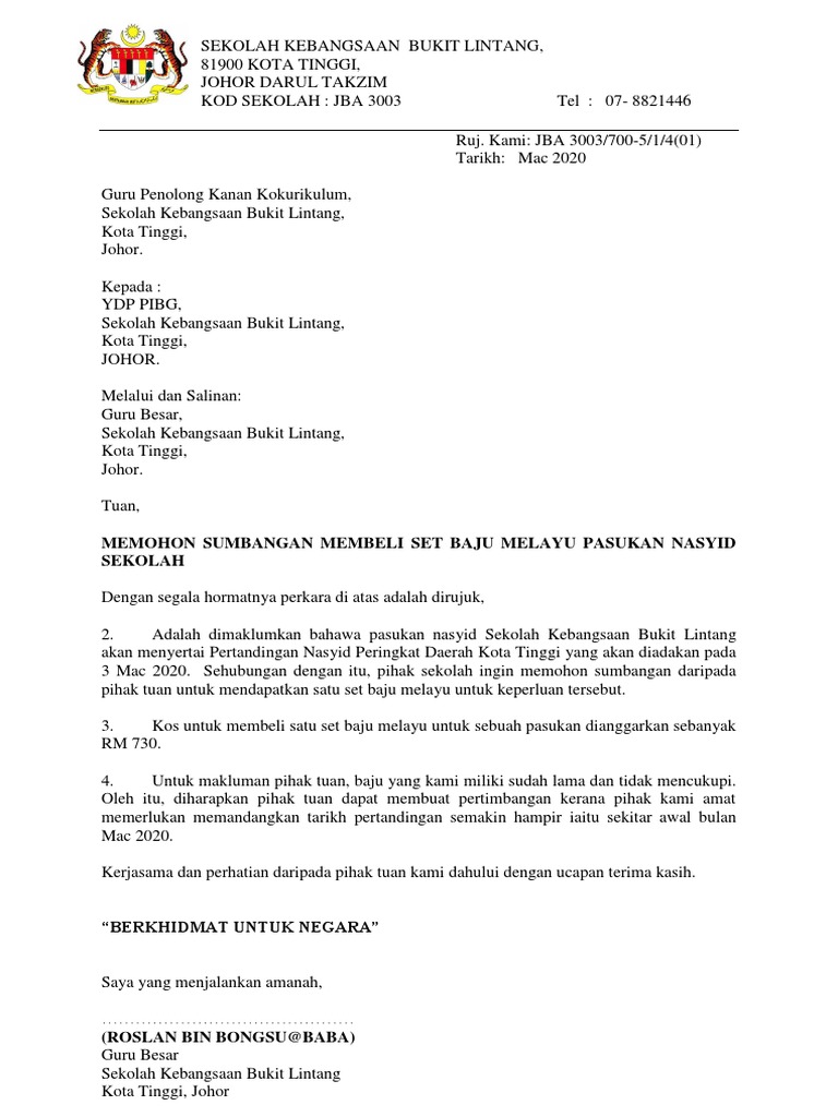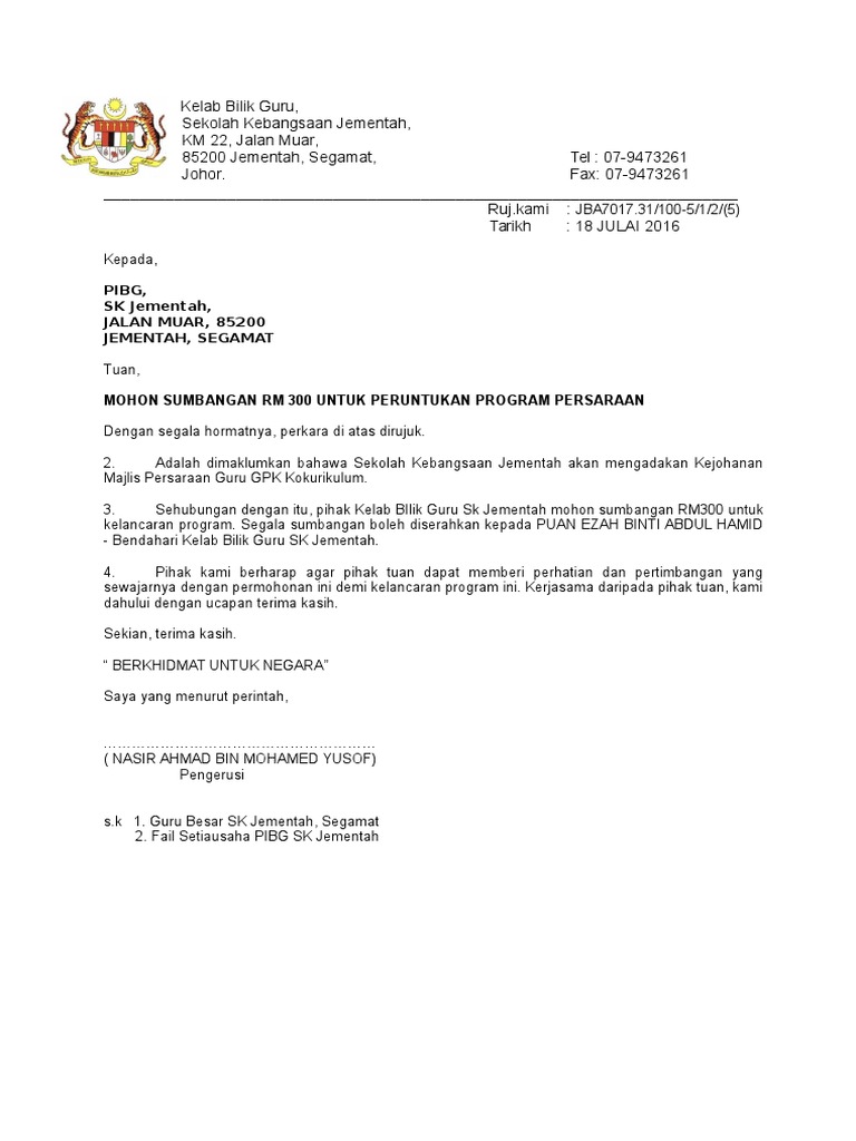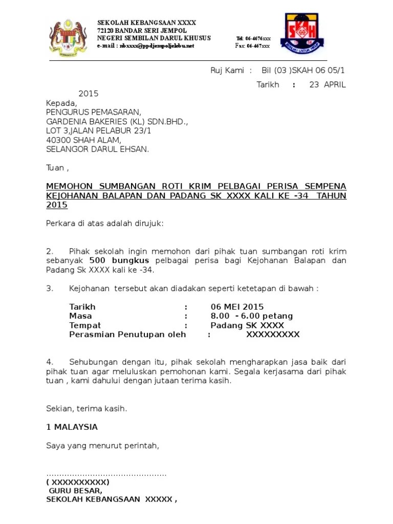 Surat Mohon Tajaan Baju Sukan from reader021.docslide.net Surat pernyataan cerai merupakan sebuah surat pernyataan yang dibuat oleh pasangan suami istri. Segmen tajaan xm bersama pengurus akaun fazrin. Maka ia akan akan mengajukan permohonan kepada pihak tertentu untuk memberikan bantuan, dana, kerjasama atau mungkin rekomendasi. Surat permohonan bantuan adalah jenis surat memohon bantuan samada kewangan,pendidikan,dana perniagaan,rumah dan biasiswa dari sesebuah organisasi,agensi dan individu. Kami mohon tuan tidak berkecil hati dengan ketentuan tersebut karena kepada siapa pun kami lakukan dengan cara yang sama. So, sesiapa yang urgent perlukan idea untuk buat surat cuti tu boleh lah rujuk contoh di bawah, just edit sikit sikit je ok? ^^ surat rasmi mohon cuti, contoh suratrasmi tidak hadir ke sekolah, contoh surat sokongan kerja, contoh surat tidak hadir ke kuliah. Hujan lebat yang berterusan telah mengakibatkan banjir lumpur dan merosakkan beberapa buah rumah penduduk,penduduk amat.