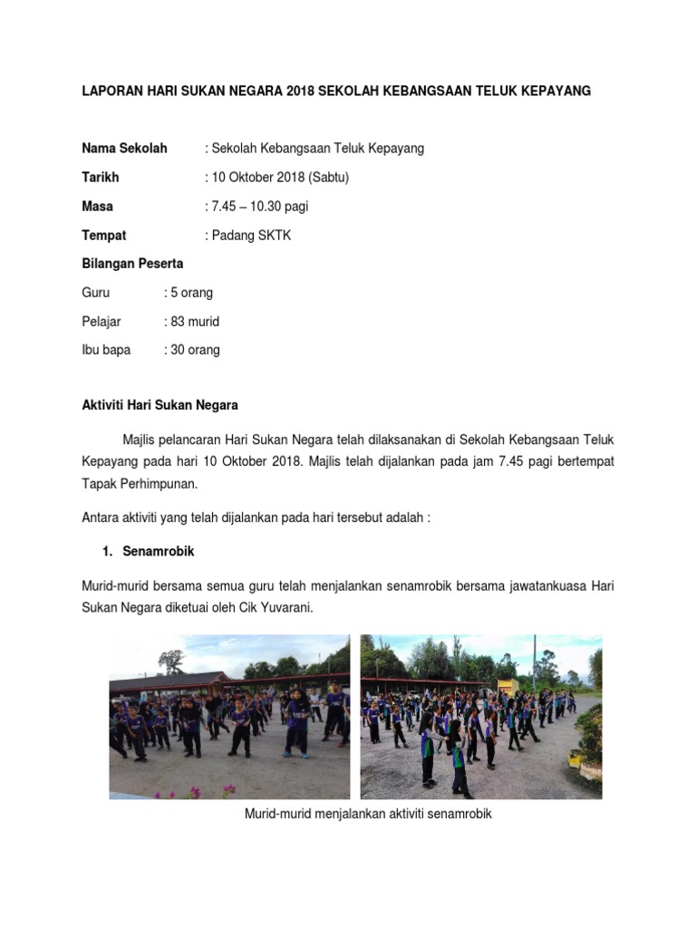Hari pengisian program yang dijalankan dalam sambutan hari sukan negara ini mengambil kira 3m, iaitu: Sekolah kebangsaan marang, marang, terengganu kertas cadangan program hari sukan negara tarikh hari masa: Laporan bergambar sempena hari sukan negara dan. Sambutan hari sukan negara 2017 telah di isytiharkan pada setiap hari sabtu minggu kedua bulan oktober setiap tahun. Pada cuti penggal kedua yang lalu, kolej vokasional kuala krai telah mengadakan hari sukan. Hari sukan negara peringkat sekolah tahun 2018. Majlis telah dijalankan pada jam 8.00 pagi bertempat di tapak perhimpunan sekolah yang dirasmikan oleh en sabarudin bin lan, guru besar sk ulu dong. Ke arah mewujudkan 'negara bersukan.' untuk itu.hari sukan negara diteruskan kesinambungannya buat edisi kedua tahun ini. Murah, menarik dan mudah dilaksanakan. Hari sukan آ hari sukan negara 2015 jabatan pendidikan negeri perak a. National sports awards) is an annual award ceremony in malaysia, organised by national sports council of malaysia since 1966. Himpunan kertas kerja dan laporan sukan tahunan. Contoh laporan hari sukan negara contoh kertas mp3 & mp4.