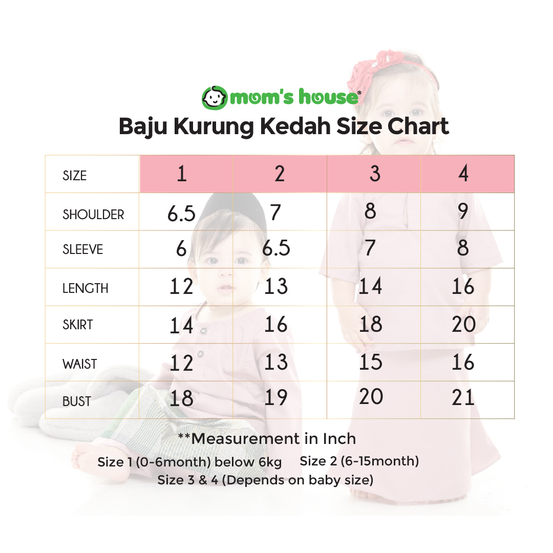 Size 4 bahu :9″ labuh tangan :10.5″ lebar tangan :5″ labuh baju :15″ labuh kain :22″ ukurlilit pinggang :18″.